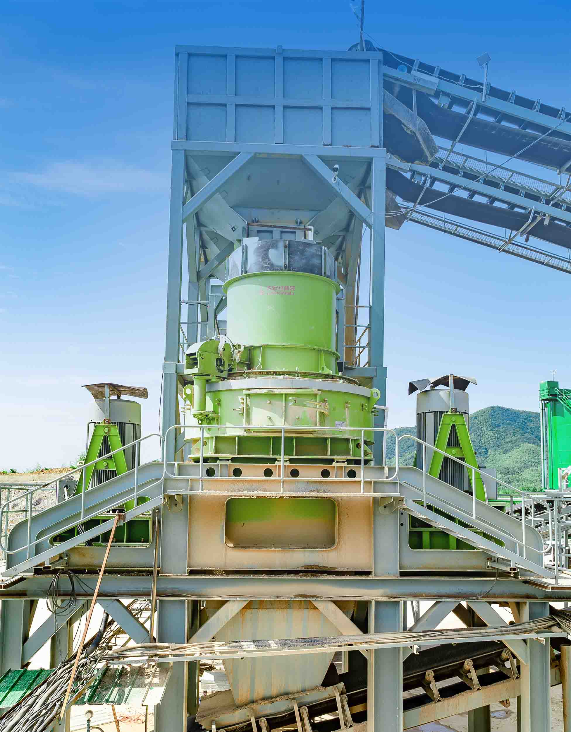 此條生產(chǎn)線以大鄂破機(jī)、單缸液壓圓錐破碎機(jī)、沖擊破制砂機(jī)、對(duì)輥機(jī)(高壓輥磨機(jī))等主機(jī)為核心,采用全自動(dòng)中央控制系統(tǒng),動(dòng)態(tài)調(diào)整成品砂石比例,甚至可實(shí)現(xiàn)全制砂生產(chǎn)